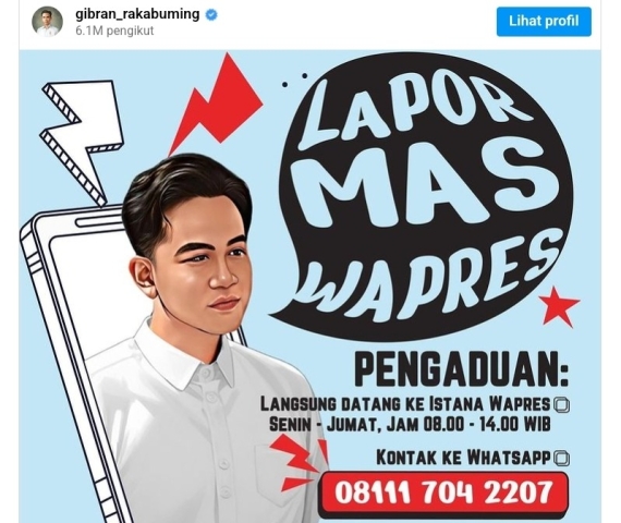 lognews.co.id - Melalui akun Instagram @gibran_rakabuming yang diunggah, Minggu (10/11/2024) Wakil Presiden (Wapres) Gibran Rakabuming Raka mengumumkan kanal pengaduan masyarakat yang dapat diakses langsung dengan mendatangi Istana Wakil Presiden maupun pesan WhatsApp, mulai Senin (11/11/2024).