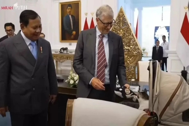 lognews.co.id, Jakarta – Pendiri Bill & Melinda Gates Foundation, Bill Gates, melakukan kunjungan resmi ke Istana Merdeka, Jakarta, dan bertemu dengan Presiden Republik Indonesia, Prabowo Subianto, Rabu (7/5'25). Dalam pertemuan tersebut, Bill Gates memberikan hadiah boneka paus Orca berwarna hitam-putih kepada kucing kesayangan Presiden Prabowo yang bernama Bobby Kertanegara, yang tengah didorong menggunakan stroller. Momen ini mencairkan suasana formal antara kedua tokoh besar tersebut.