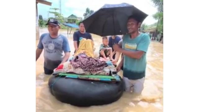 Warga setempat secara bergotong royong menunjukkan kreativitas dengan memanfaatkan papan kayu dan ban bekas sebagai alat evakuasi darurat untuk membawa ibu yang mengalami kontraksi dan melahirkan ini ke rumah sakit.