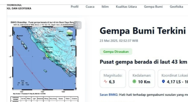 lognews.co.id, Bengkulu – Wilayah Bengkulu diguncang gempa bumi berkekuatan magnitudo 6,3 pada Jumat dini hari (23/5/25) sekitar pukul 02.52 WIB. Berdasarkan informasi resmi Badan Meteorologi, Klimatologi, dan Geofisika (BMKG), pusat gempa terletak di laut, sekitar 39-47 km barat daya Kota Bengkulu, dengan kedalaman bervariasi antara 10 hingga 84 km, tergantung pada laporan awal dan pembaruan data.