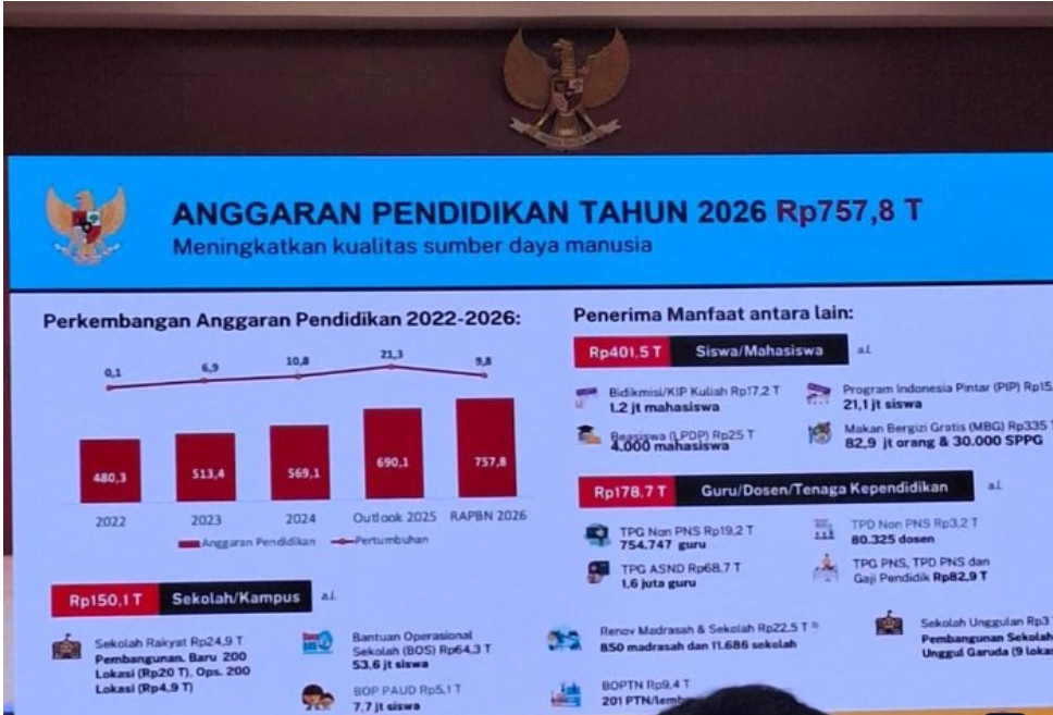 "Untuk memberantas kemiskinan, pemerintah berkomitmen anggaran pendidikan 20% yaitu sekitar Rp757,8 triliun untuk tahun 2026. Terbesar sepanjang sejarah NKRI," ujar Prabowo. (sahil untuk Indonesia)