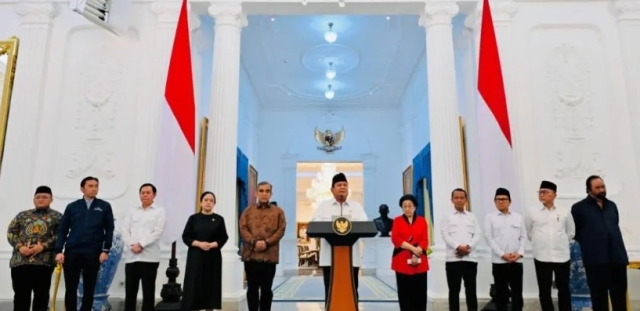 Pernyataan tersebut disampaikan Prabowo didampingi oleh delapan ketua umum parpol di DPR, yakni Ketua MPR Ahmad Muzani, Ketua DPR RI Puan Maharani, Ketua DPD RI Sultan Najamudin.