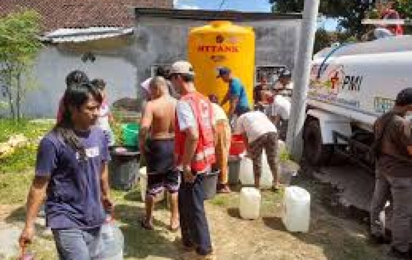 Karena sejak Februari yang lalu banyak sumur warga yang kering dan kesulitan untuk memenuhi kebutuhan minum warganya maka petugas BPBD maupun PMI datang memberi bantuan air bersih.