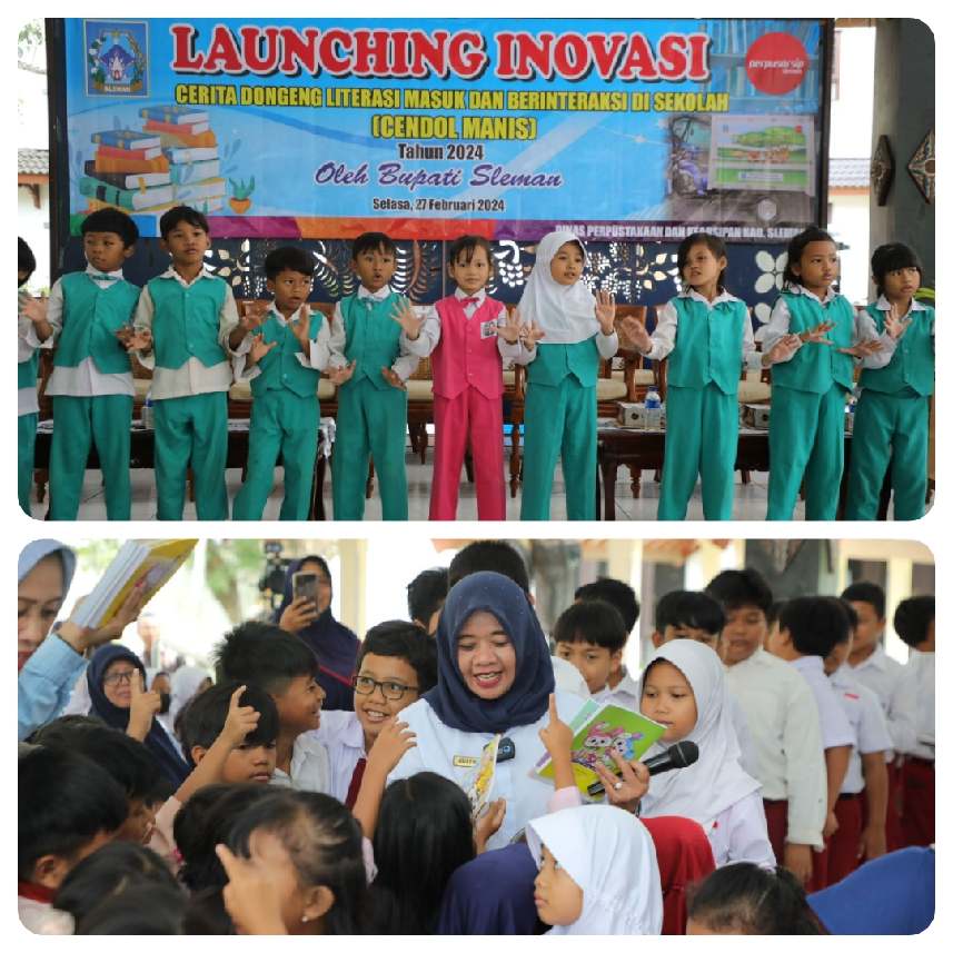 lognews.com, Sleman - Bupati Sleman Kustini Sri Purnomo meluncurkan inovasi program litersi Cerita dan Dongeng Literasi Masuk dan Berinteraksi di Sekolah (CENDOL MANIS) yang diinisiasi Dinas Perpustakaan dan Kearsipan Kabupaten Sleman, bertempat di Pendopo Rumah Dinas Bupati Sleman pada Selasa (27/2). Peresmian inovasi ini dilakukan secara simbolis pleh Bupati Sleman yang ditandai dengan pemukulan gong.