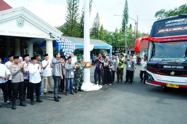 lognews.co.id,Indramayu – Bupati Indramayu Lucky Hakim melepas keberangkatan 445 calon jemaah haji asal Kabupaten Indramayu yang tergabung dalam Kloter 4 KJT menuju tanah suci, di Halaman Pendopo Indramayu, Minggu malam (4/5). Pelepasan ini menjadi momentum penting bagi para calon haji sekaligus harapan bagi kemajuan daerah. ( 4/5/'25)