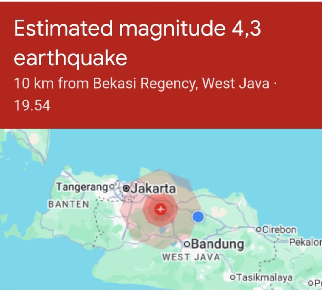 lognews.co.id - Gempa bumi dengan estimasi magnitudo 4,3 mengguncang wilayah Bekasi, Jawa Barat, pada Selasa malam sekitar pukul 19.54 WIB. Pusat gempa berada sekitar 10 kilometer dari Kabupaten Bekasi.