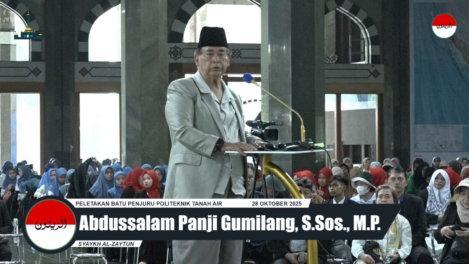 Di tengah hujan rahmat yang memaksa acara berpindah ke dalam Masjid Rahmatan lil 'Alamin, Syaykh Al-Zaytun, A.S. Panji Gumilang, menyampaikan tausiyah yang bukan sekadar pidato biasa, melainkan sebuah manifesto perjuangan dan visi pendidikan. Dengan gaya khasnya yang lugas, ia membuka tabir tantangan berat yang dihadapi: dari kenaikan pajak bumi dan bangunan yang melonjak drastis dari 240 juta menjadi 3,5 miliar rupiah, hingga dana abadi pendidikan senilai ratusan miliar yang dibekukan, sebuah kondisi yang ia sebut sebagai "diboykot oleh bangsanya sendiri." Namun, di tengah kepungan badai tersebut, ia berdiri tegak dengan falsafah kesatria Jawa "ngluruk tanpo bolo, menang tanpo ngasorake" (menyerbu tanpa pasukan, menang tanpa mempermalukan), menjadikan setiap rintangan sebagai pemantik untuk melahirkan sebuah terobosan baru bernama Politeknik University Tanah Air.