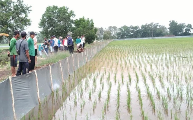 - Sistem ini menggunakan pagar plastik dan bubu perangkap yang dipasang mengelilingi lahan padi.