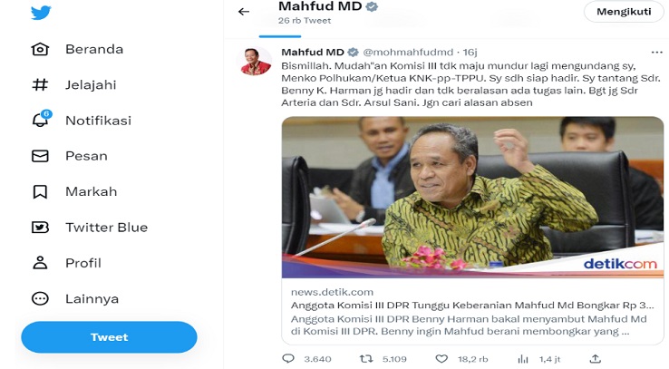 "Bismillah, mudah-mudahan Komisi III tidak maju mundur lagi mengundang saya, Menko Polhukam/Ketua KNK-pp-TPPU, saya sudah siap hadir," ujar Mahfud dalam Twitternya, seperti dilihat, Minggu (26/3/2023).