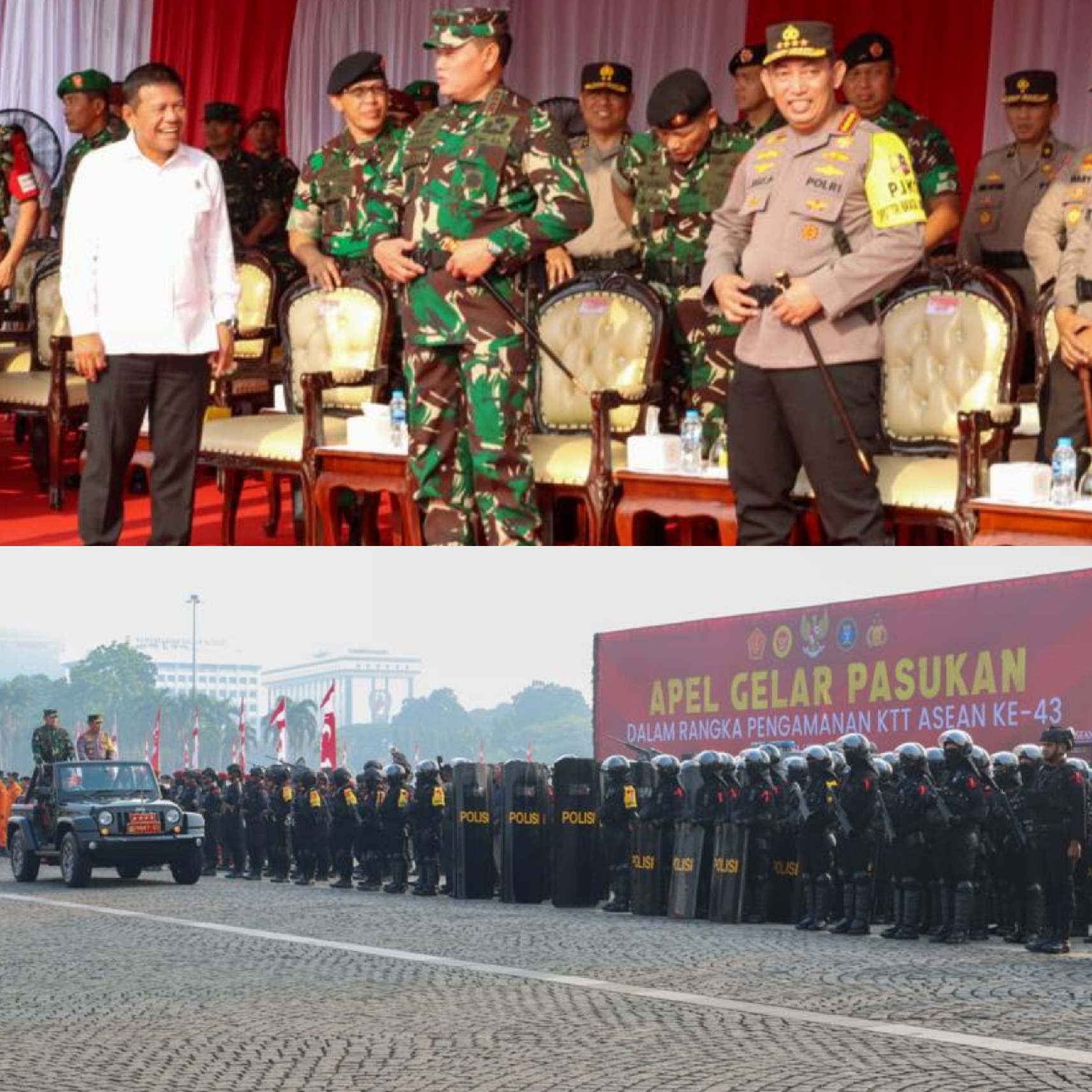 Kapolri Jenderal Listyo Sigit Prabowo dan Panglima TNI Laksamana Yudo Margono memimpin langsung ribuan personel gabungan dari TNI - Polri melaksanakan Apel Gelar Pasukan VVIP Pengamanan KTT Asean ke-43 Tahun 2023 dalam rangka pengecekan kesiapan personel, materil maupun sarana prasarana yang akan digunakan, juga wujud komitmen dan keseriusan dalam hal pengamanan tamu para pimpinan atau kepala negara dari negara-negara Asean serta negara mitra strategis Asean.
