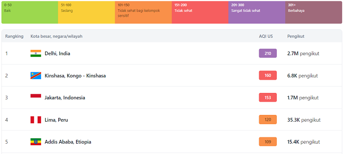 Dari pantauan berkala, ternyata posisi udara terburuk selanjutnya digantikan oleh Delhi, India (210) dan Kinshasa, Kongo (160) diikuti Jakarta, Indonesia (153) pada pukul 13.55 WIB (28/5/2024).