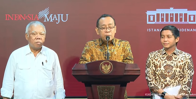 lognews.co.id, Jakarta - Menteri Sekretaris Negara Pratikno mengumumkan keputusan presiden tentang pemberhentian dengan hormat Kepala Otorita IKN, Bambang Susantono sebagai dan Dhony Rahajoe sebagai Wakil Kepala Otorita IKN di Kantor Presiden, Jakarta, Senin (3/6/2024)
