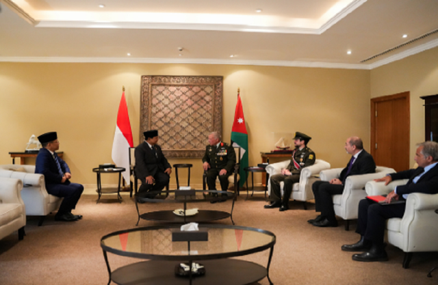 “Assalamu’alaikum warahmatullahi wabarakaatuh, H.E. Abdullah II bin Al-Hussein. Terima kasih dan penghargaan atas kesempatan kali ini. Senang sekali bertemu dengan Anda, Yang Mulia,” sapa Menhan Prabowo.