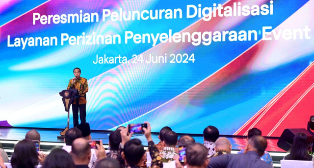 lognews.co.id Jakarta - Diselenggarakan di The Tribrata Darmawangsa Presiden Joko Widodo secara resmi meluncurkan digitalisasi layanan perizinan penyelenggaran event dalam rangka mempercepat proses perizinan di Indonesia, Jakarta, pada Senin, 24 Juni 2024.