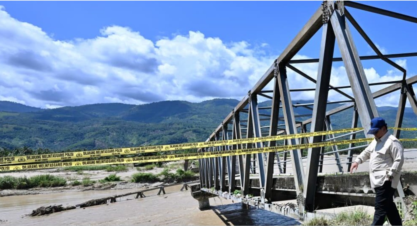 Sesaat setelah tiba, Presiden langsung menuju titik kerusakan untuk memantau kondisi jembatan yang merupakan akses utama penghubung beberapa kecamatan. Kini, hanya tersisa rangka baja yang tergerus derasnya arus sungai, yang menggambarkan betapa parahnya dampak banjir tersebut.