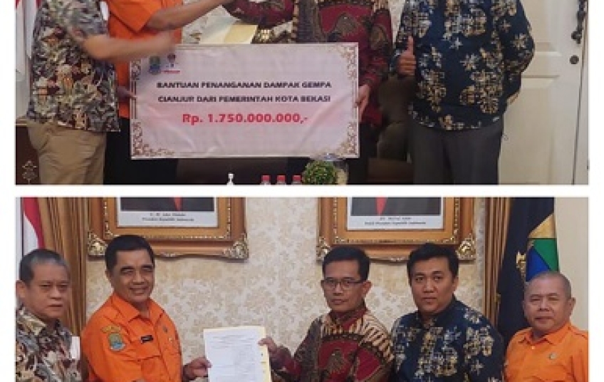 Lognews201.Com - Kota Bekasi - Kepala Pelaksana Badan Penanggulangan Bencana Daerah Kota Bekasi, Enung Nurholis beserta jajarannya didampingi Kabag Kesos Ujang Tedi dan Perwakilan BPKAD Rully Chairul mewakili Pemerintah Kota Bekasi menyerahkan bantuan sejumlah Rp. 1.750.000.000,- bersumber dari bantuan keuangan APBD Tahun Anggaran 2022 serta Donasi dari seluruh warga masyarakat Kota Bekasi yang telah dikumpulkan pada saat pasca kejadian gempa Cianjur kemarin.
