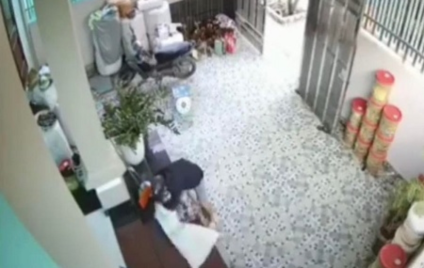 Pria itu mencari sesuatu di halaman rumah dan menemukan karung, dia lantas hendak memasukan anak kecil itu kedalam karung.