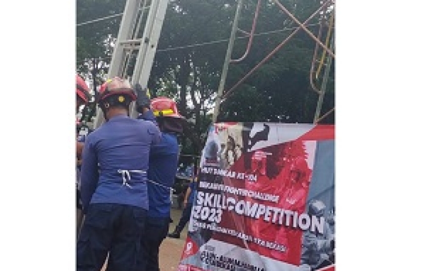 Terlihat para petugas melakukan adu kecepatan antar sektor dalam lomba Ladder Pitching, yakni lomba antar sektor mengenai lomba setting tangga dan tali temali untuk evakuasi korban demi penyelamatan dengan kerjasama yang kuat antar petugas.