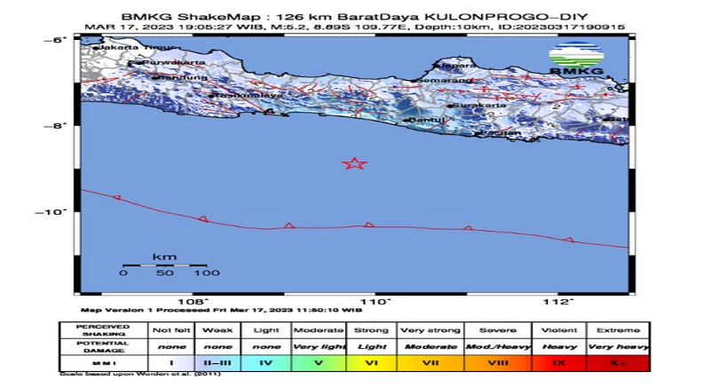 "Gempa dirasakan Magnitudo: 5,2 pada 17 Maret 2023 12:05:27", tulis BMKG pada keterangan rilisnya. Gempa terjadi pada koordinat pada 8.89 LS (Lintang Selatan) dan 109.77 BT (Bujur Timur).  (Koko)
