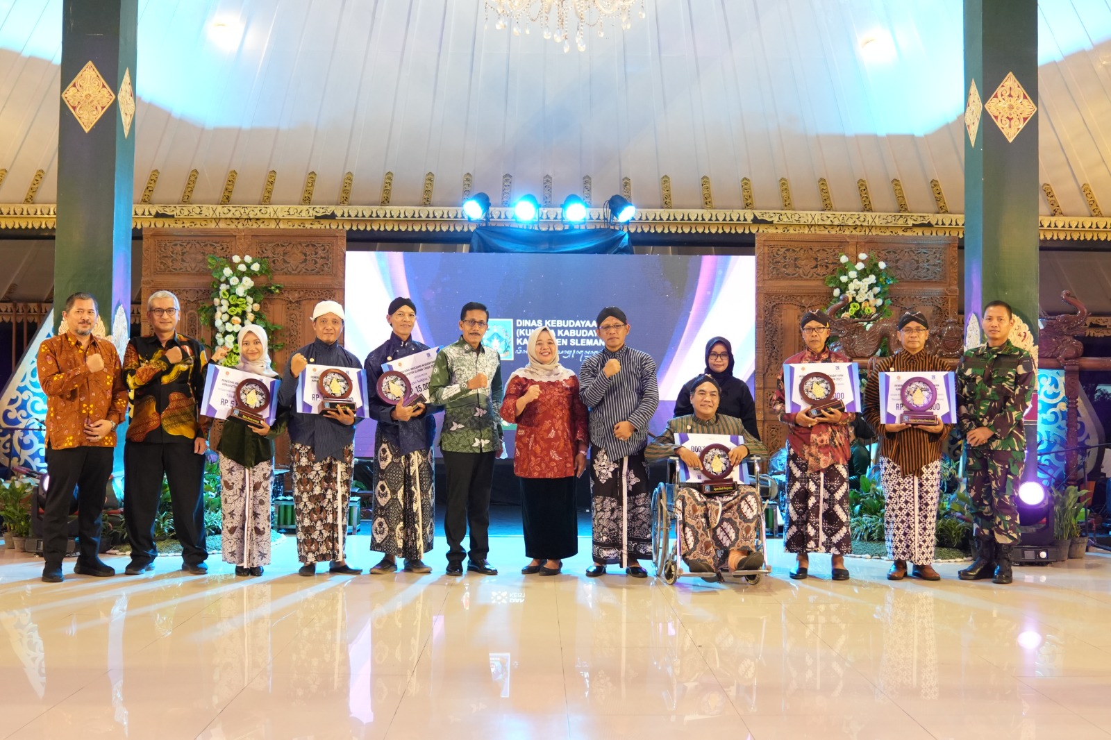 Bupati Sleman, Kustini Sri Purnomo menyerahkan secara langsung penghargaan Anugrah Kebudayaan kepada 6 Seniman/Budayawan Sleman dari 6 kategori.