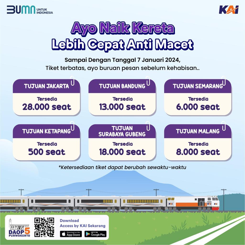 lognews.co.id, Di hari ketiga Januari 2024, tepatnya Rabu (3/1/2024), PT KAI (Persero) Daop 5 Purwokerto mencatat informasi sisa tiket atau Tempat Duduk (TD) hingga berita ini diturunkan, masih terdapat TD yang tersedia untuk periode 3-7 Januari 2024 dengan rincian sebanyak 28.000 TD tujuan Jakarta, 13.000 TD tujuan Bandung, 6.000 TD tujuan Semarang, 18.000 TD tujuan Surabaya Gubeng, 8.000 tujuan Malang, dan 500 TD tujuan Ketapang. KAI Daop 5 Purwokerto mengimbau kepada pelanggan untuk segera mempersiapkan perjalanan jauh-jauh hari agar semakin nyaman dan leluasa. Pemesanan tiket dapat dilakukan di aplikasi Access by KAI, web kai.id, atau channel resmi mitra KAI lainnya.