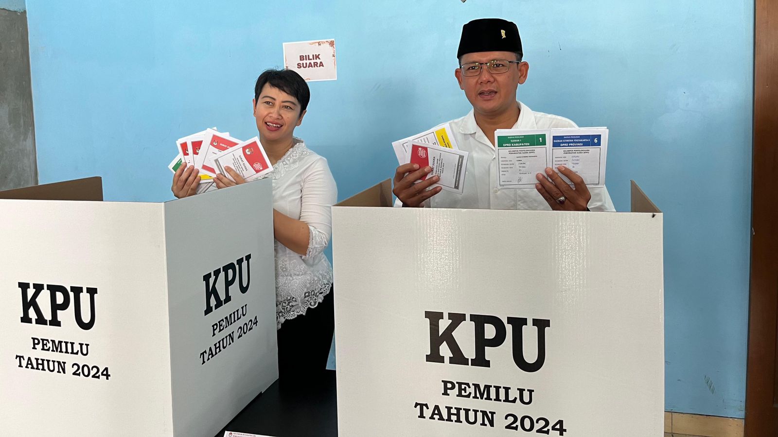 lognews.co.id, Sleman - Wakil Bupati Sleman Danang Maharsa berserta Istrinya Ketua PKK Kabupaten Sleman Sri Hapsari Suprobo Dewi dan keluarga, menggunakan hak pilihnya (menyoblos pada pemilihan umum tahun 2024 di Tempat Pemungutan Suara (TPS) 33 Beran Kidul, Kalurahan Tridadi, Kabupaten Sleman pada Rabu (14/02).