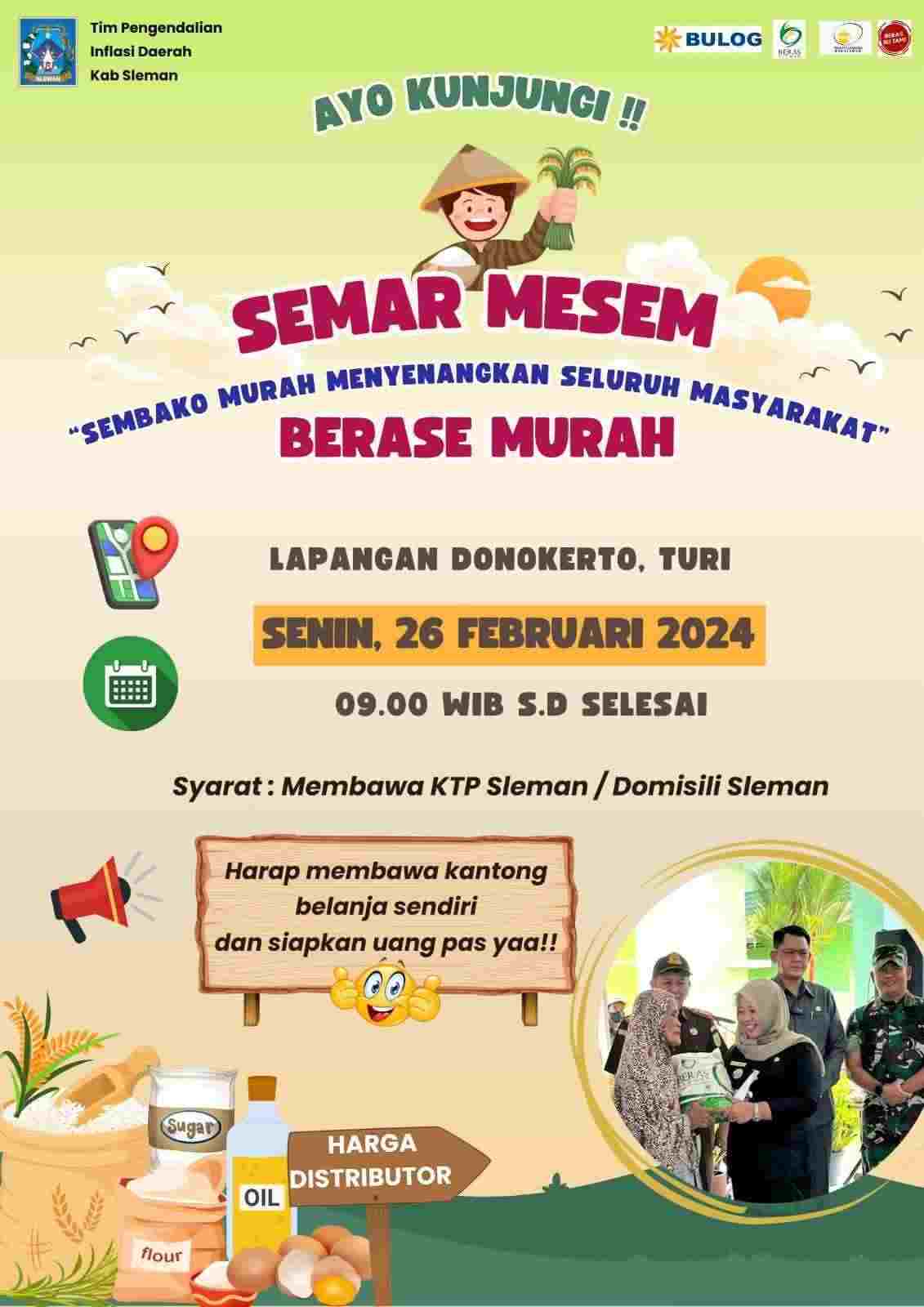 Agenda pasar murah SEMAR MESEM akan dilaksanakan di lapangan Tridadi Mlati pada tanggal 21 Februari 2024, di lapangan TGP Margoluwih Seyegan pada tanggal 22 Februari 2024. Pasar murah di lapangan Donokerto Turi pada tanggal 26 Februari 2024 dan di lapangan Raden Ronggo Kalasan pada tanggal 27 Februari 2024. (Joko Suwanto untuk Sleman)