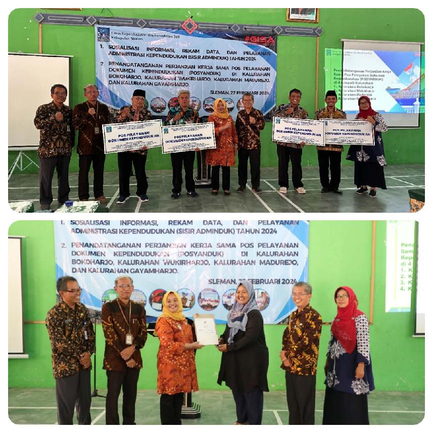 Bupati Sleman, Kustini Sri Purnomo hadir pada kesempatan dan sekaligus menyaksikan penandatanganan kerjasama Pos Pelayanan Dokumen Kependudukan (Posyanduk) untuk Kalurahan Bokoharjo, Madurejo, Wukirharjo dan Gayamharjo.