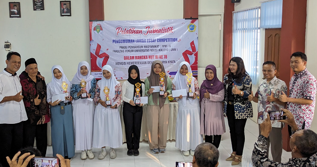 Pengumuman dan serahterima hadiah juara menulis esai sekaligus pembinaan tentang materi jurnalistik ditinjau dari aspek hukum disampaikan oleh Doktor Arista Candra Irawati. SH.MH.