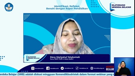 Selanjutnya, Devy Mariyatul Ystykomah, Guru SMP PGRI 4 Kota Kediri, Jawa Timur mengajak para guru untuk menjadikan Rapor Pendidikan sebagai alat refleksi dalam kegiatan pembelajaran. “Dengan Rapor Pendidikan mari kita berefleksi untuk mengidentifikasi pencapaian kualitas sekolah, kemudian mengambil langkah dalam melakukan pembenahan yang berbasis data,” tutur Devy.