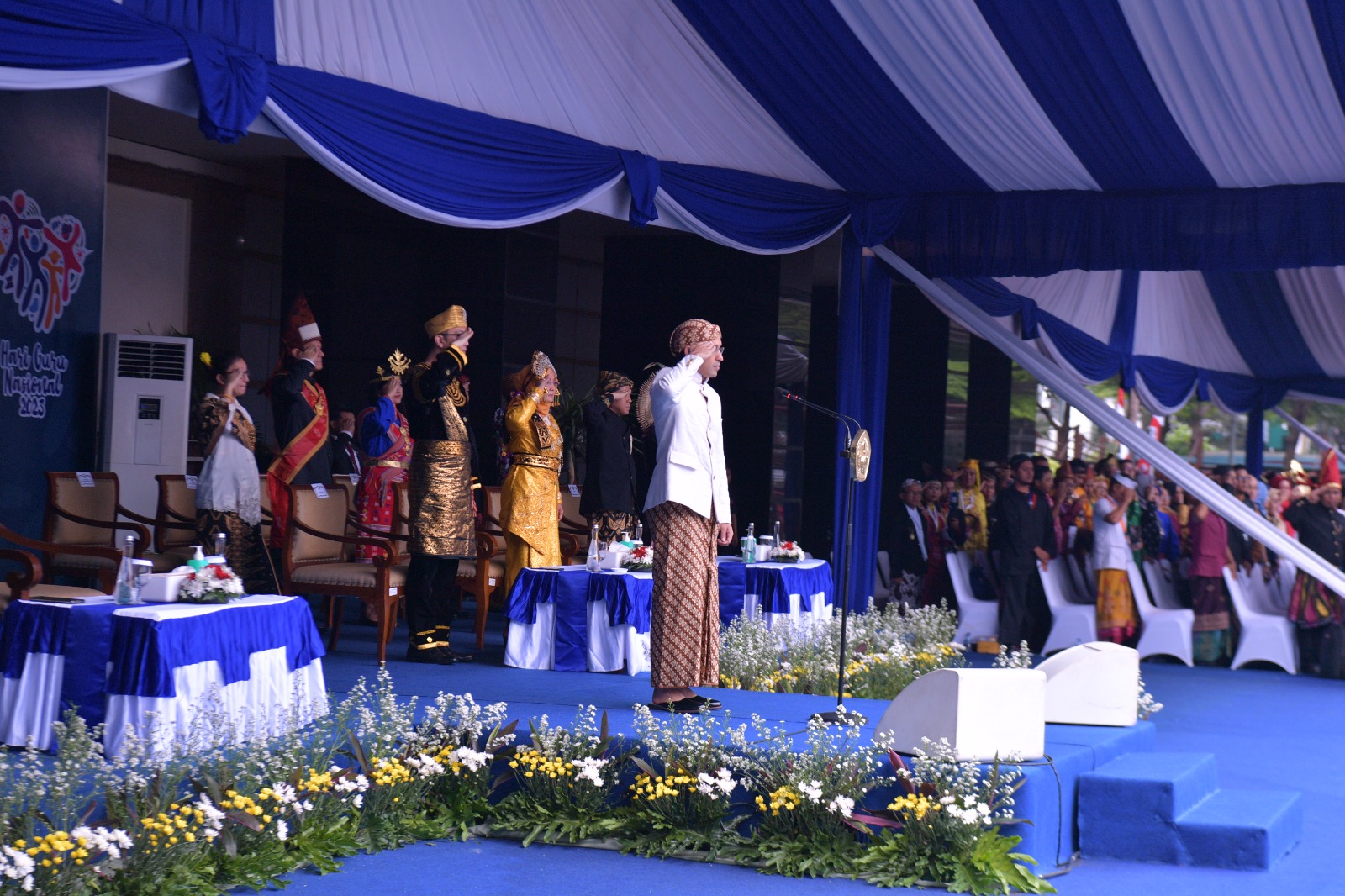 “Selamat Hari Guru Nasional. Mari kita rayakan hari ini dengan semangat untuk terus melaju ke depan, dengan derap langkah serentak melanjutkan gerakan Merdeka Belajar,” tutur Menteri Pendidikan, Kebudayaan, Riset, dan Teknologi (Mendikbudristek), Nadiem Anwar Makarim, di Kantor Kemendikbudristek, Senayan, Jakarta, Sabtu (25/11), yang pada kesempatan ini menggunakan baju adat Jawa Tengah.