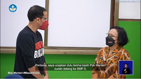 Lognews201.com,Jakarta- Di tengah suasana gembira para siswa menikmati pembelajaran tatap muka (PTM), Menteri Pendidikan, Kebudayaan, Riset, dan Teknologi (Mendikbudristek) Nadiem Anwar Makarim tiba-tiba masuk kelas VIII SMP Negeri 5 Jakarta. Bersama Desta yang sudah masuk terlebih dahulu, Mendikbudristek yang sering disapa Mas Menteri ini hadir menjadi guru tamu menemani Ladi Diana Tarigan dalam segmen #masukkelas tayangan Puncak Peringatan Hari Pendidikan Nasional (Hardiknas) Tahun 2022 yang ditayangkan di kanal YouTube Kemendikbud RI, TV Edukasi, dan Indonesiana.TV, pada Jumat (13/5).