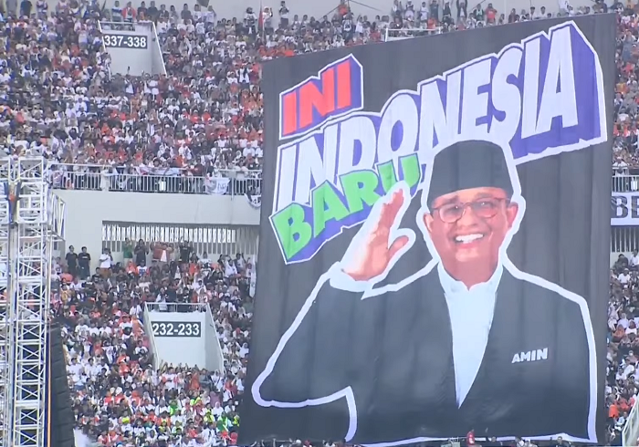 Nampak kehadiran Capres-Cawapres, Anies - Muhaimin ke atas panggung dengan saling bergandengan, bersamaan dengan dinaikannya poster super besar dari sudut bangku penonton, bergambarkan Anies yang sedang hormat, memakai jas, berpeci hitam dan bacaan "INI INDONESIA BARU".
