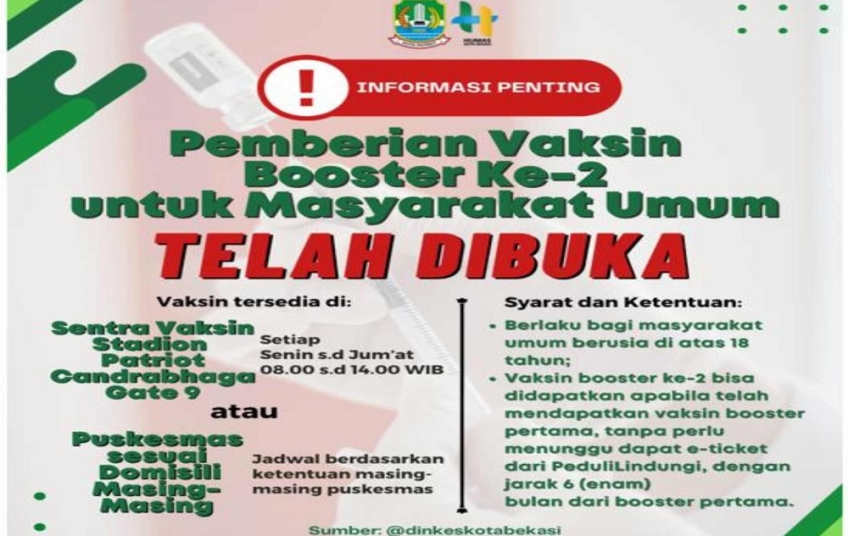 Lognews201.com, Bekasi  -  Pemerintah Kota Bekasi, Senin - Jumat pada pukul 08.00-14.00 WIB, membuka layanan vaksinasi booster ke-2 di Stadion Patriot Candrabhaga Gate 9 Kota Bekasi dan puskesmas sesuai domisili masing-masing.