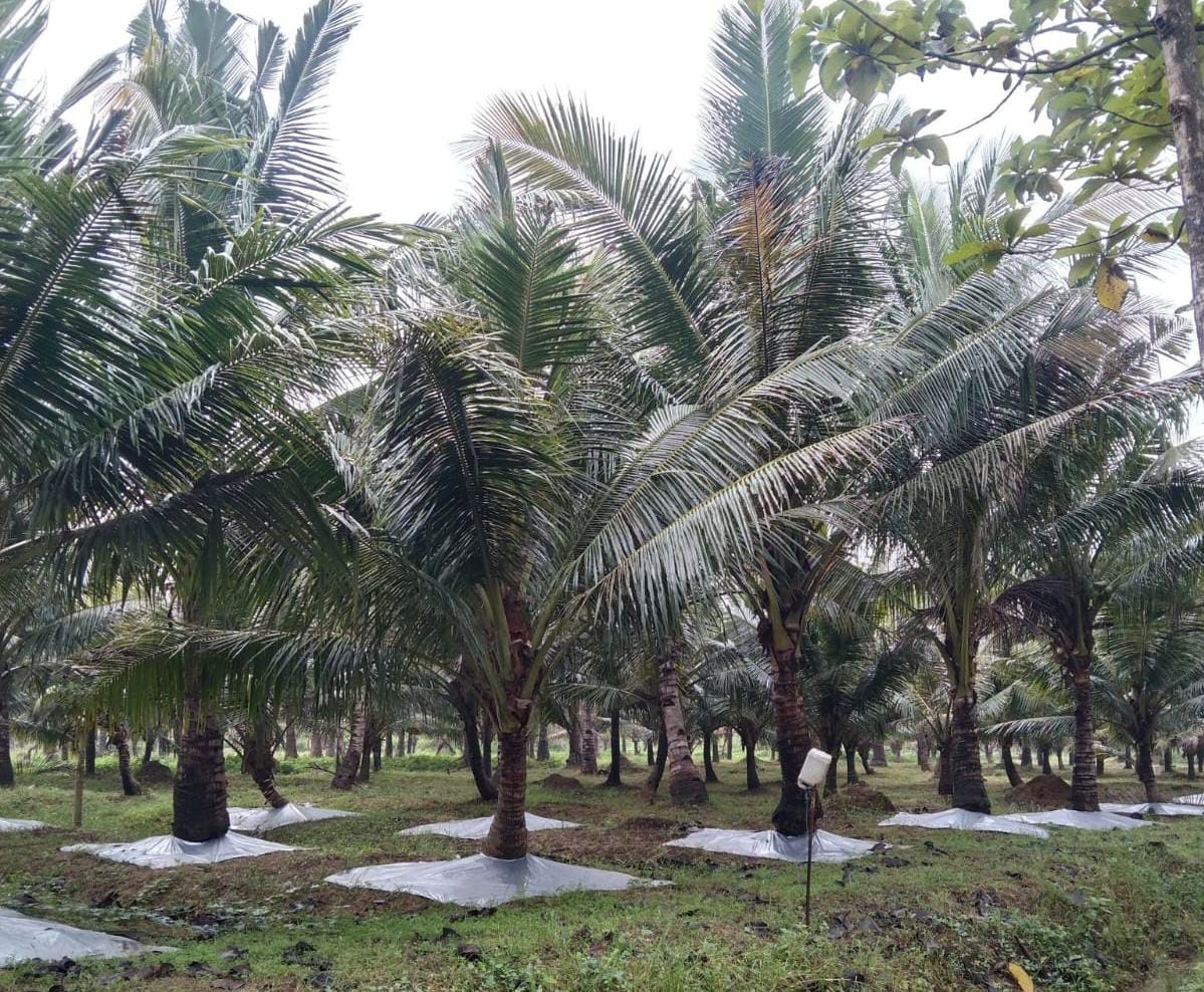 Sementara itu, sisi hitam pada mulsa berperan menjaga suhu dan kelembaban tanah agar tetap stabil. Teknologi ini terbukti efektif menekan pertumbuhan gulma yang sering mencuri nutrisi tanaman utama. Dengan tertutupnya permukaan tanah, erosi akar akibat air hujan dapat dicegah, sehingga struktur tanah di sekitar pohon kelapa tetap terjaga dengan baik dan efisiensi pemupukan meningkat.
