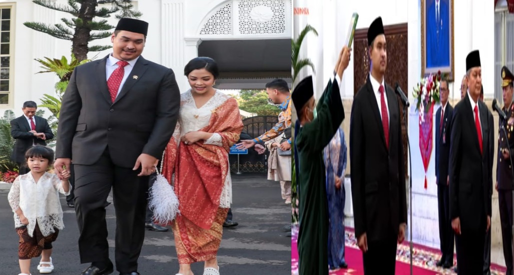 Menpora Dito dilantik Presiden Jokowi di Istana Negara, Jakarta, Senin (3/4). Menpora Dito hadir di Istana bersama istri Niena Kirana Riskyana dan sang anak, Sadia serta keluarga.