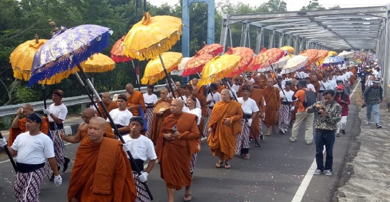 Dengan diarak oleh penganut Budha terlihat membawa air berkah Waisak yang berasal dari Umbul Jumprit di Kabupaten Temanggung dan api dharma Waisak yang diambil dari Mrapen Kabupaten Grobogan.