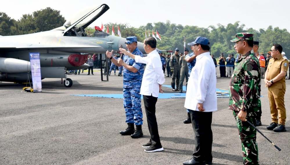 lognews.co.id, Kabupaten Magetan - Presiden Joko Widodo bersama Menteri Pertahanan Prabowo Subianto, Panglima TNI Jenderal Agus Subiyanto, dan Kepala Staf TNI Angkatan Udara (KSAU) Marsekal Fadjar Prasetyo melihat kesiapan tiga pesawat tempur TNI AU, yakni dua pesawat F-16 dan satu pesawat T-50 di Pangkalan TNI AU Iswahjudi, Kabupaten Magetan pada kunjungan kerjanya di Provinsi Jawa Timur pada Jumat, (8/3/2024).