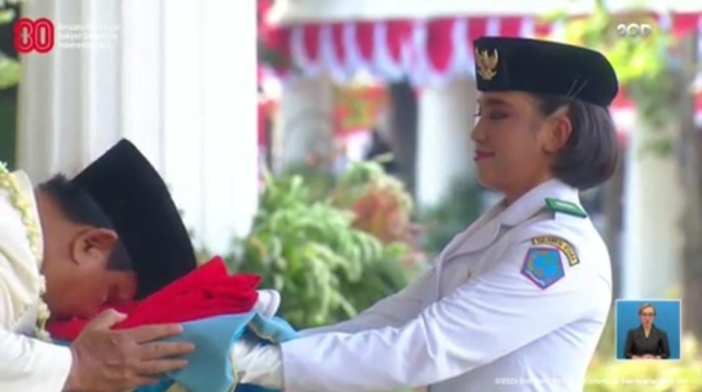 lognews.co.id - Presiden Prabowo Subianto tampak mencium bendera Merah Putih sebelum dikibarkan oleh Tim Paskibraka dalam upacara peringatan HUT ke-80 RI. Momen itu terjadi saat ia menyerahkan bendera kepada pembawa baki.