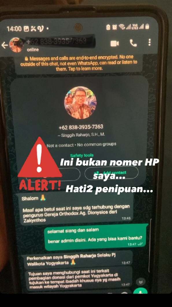 lognews.co.id, Umbulharjo - Pemerintah Kota (Pemkot) Yogyakarta mengklarifikasi upaya penipuan melalui pesan WhatsApp, dengan mengatasnamakan Penjabat Wali Kota Yogyakarta, Singgih Raharjo.