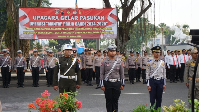 lognews.co.id, Kota Magelang - Polres Magelang Kota Polda Jateng, melaksanakan Upacara Gelar Pasukan “Operasi Mantap Praja Candi 2024-2025” sebagai bagian dari persiapan pengamanan Pemilihan Gubernur, Wakil Gubernur, Bupati, Wakil Bupati, serta Walikota dan Wakil Walikota Tahun 2024. Upacara tersebut diadakan di depan Mako Polres Magelang Kota pada Jumat, (23/8/2024) .