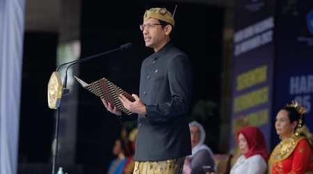 Lognews201.com, Jakarta – Menteri Pendidikan, Kebudayaan, Riset, dan Teknologi (Mendikbudristek), Nadiem Anwar Makarim memimpin upacara peringatan Hari Guru Nasional (HGN) tahun 2022 di Kompleks Kementerian Pendidikan, Kebudayaan, Riset, dan Teknologi (Kemendikbudristek) Senayan, Jakarta pada Jumat (25/11). Mengenakan busana dari Surabaya, Jawa Timur, Mendikbudristek mengajak semua guru agar terus berinovasi, menciptakan perubahan dan kebaruan untuk melompat ke masa depan.