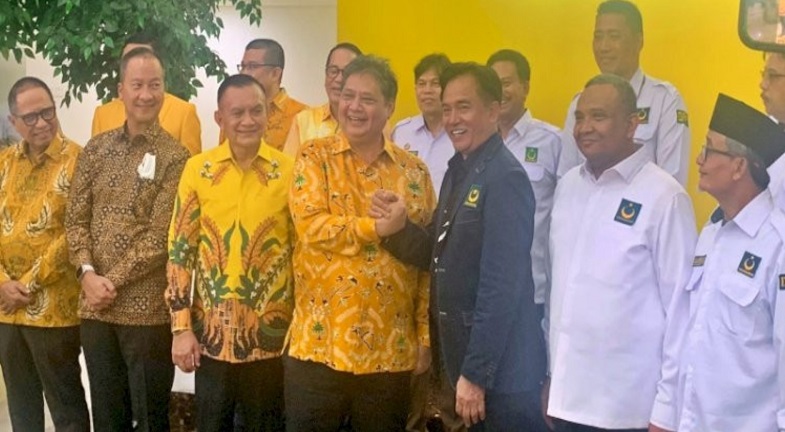 Ketua Umum PBB Yusril Ihza Mahendra adakan kunjungan ke Ketua Umum Partai Golkar, Airlangga Hartarto, di DPP Golkar, Jalan Anggrek Neli, Jaksel, Selasa (21/3/2023).