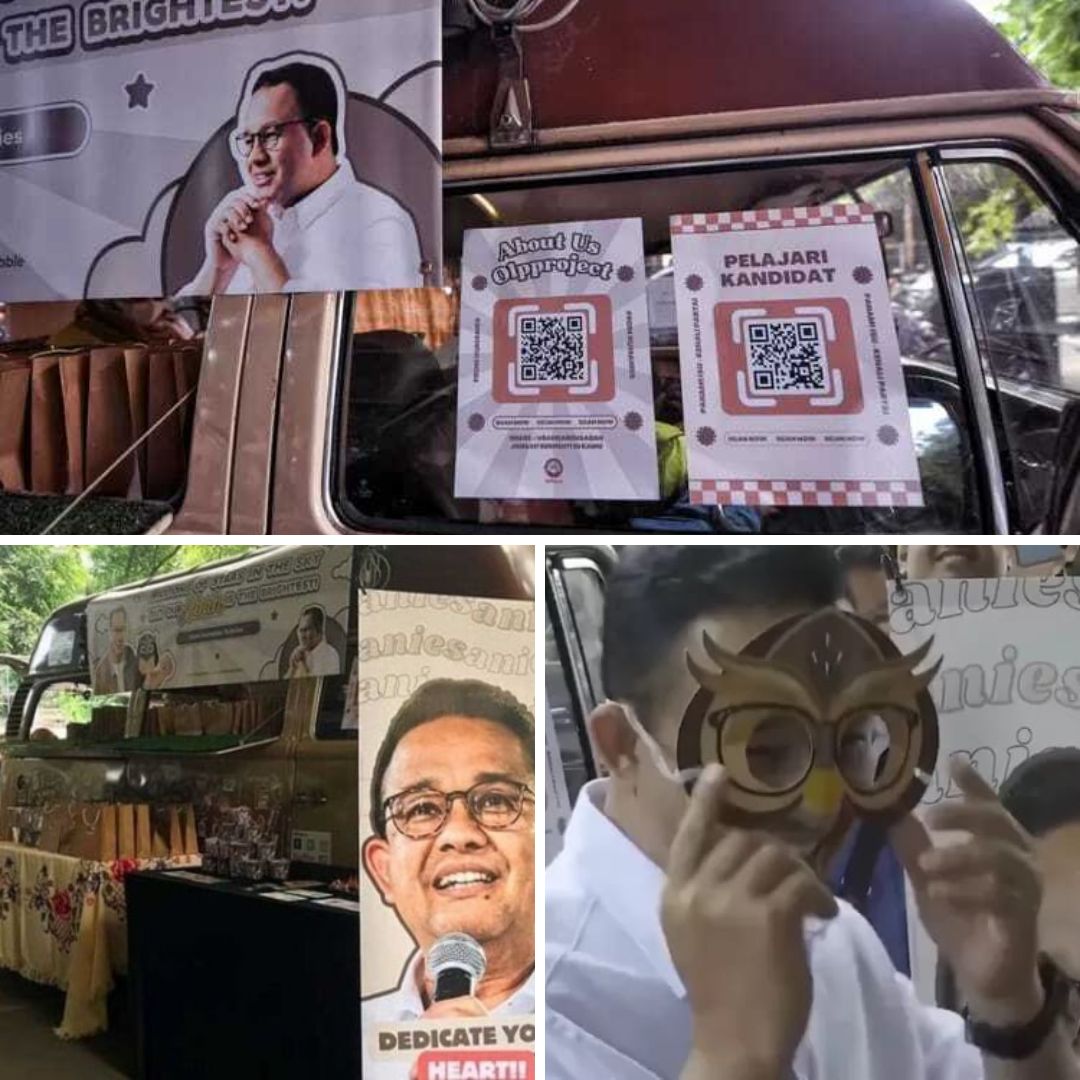 Food truck berwarna coklat muda bertuliskan 'Billion of stars in the sky, but our Abah is the brightest! From Humanies to Anies' yang artinya: Jutaan Bintang di Langit, Tapi Abah Kami Adalah Yang Paling Terang serta dihiasi ilustrasi burung hantu selain itu, ada pula standee character mantan Gubernur DKI Jakarta itu tengah love sign ala idol-idol K-pop.