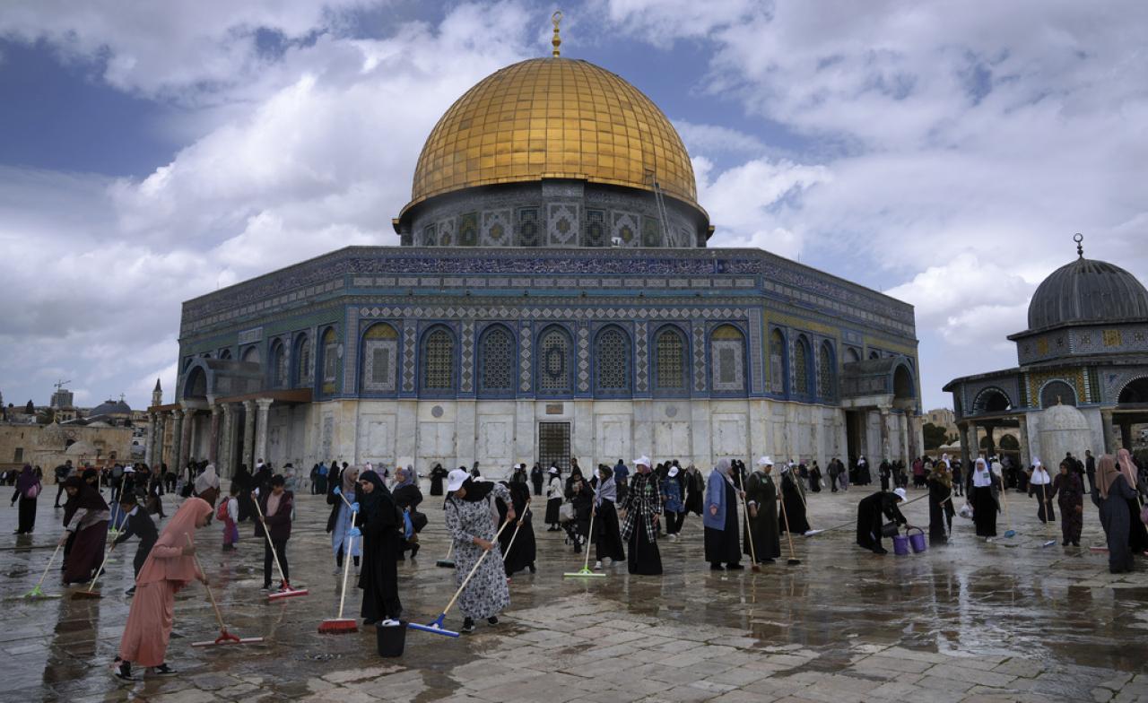 Banyak kaum muslimin dari kalangan muda dan tua, pria dan wanita dan Relawan Palestina lainnya membersihkan tanah di luar Masjid Kubah berkubah emas di kompleks Masjid Al-Aqsa.