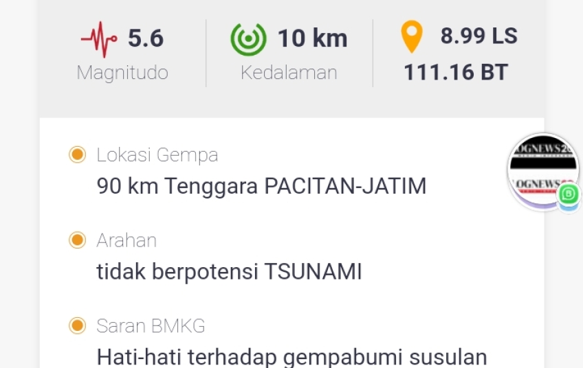 Lognews201.com, Pacitan - Jawa Timur telah terjadi gempa bumi magnitudo 5,6 di pusat gempa Pacitan Jatim dikedalam 10 km.