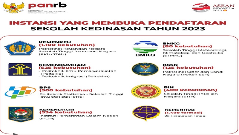 Terdapat delapan instansi yang membuka pendaftaran sekolah kedinasan tahun ini. Delapan instansi tersebut yaitu Kementerian Hukum dan HAM; Kementerian Keuangan; Kementerian Perhubungan; Kementerian Dalam Negeri; Badan Intelijen Negara; Badan Siber dan Sandi Negara; Badan Pusat Statistik; dan Badan Meteorologi, Klimatologi, dan Geofisika.