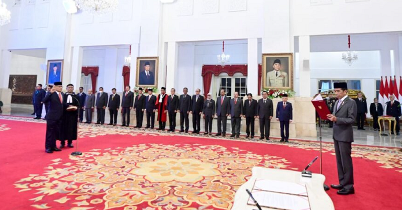 “Saya berjanji bahwa saya akan setia dan taat kepada Undang-Undang Dasar Negara Republik Indonesia Tahun 1945 serta akan menjalankan segala peraturan perundang-undangan dengan selurus-lurusnya demi darma bakti saya kepada bangsa dan negara,” ujar Presiden Jokowi mendiktekan sumpah jabatan.