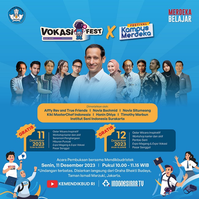Dalam rangka mempromosikan capaian pendidikan vokasi dengan inovasi kebijakan Merdeka Belajar Kampus Merdeka (MBKM) dalam membangun SDM unggul, Kementerian Pendidikan, Kebudayaan, Riset, dan Teknologi (Kemendikbudristek) akan menggelar Vokasifest dan Festival Kampus Merdeka (FKM) 2023. Kedua acara besar tersebut akan diselenggarakan secara bersamaan di Graha Bhakti Budaya, Taman Ismail Marzuki, Jakarta, pada 11—12 Desember 2023 dan dijadwalkan akan dibuka langsung oleh Presiden Republik Indonesia, Joko Widodo.