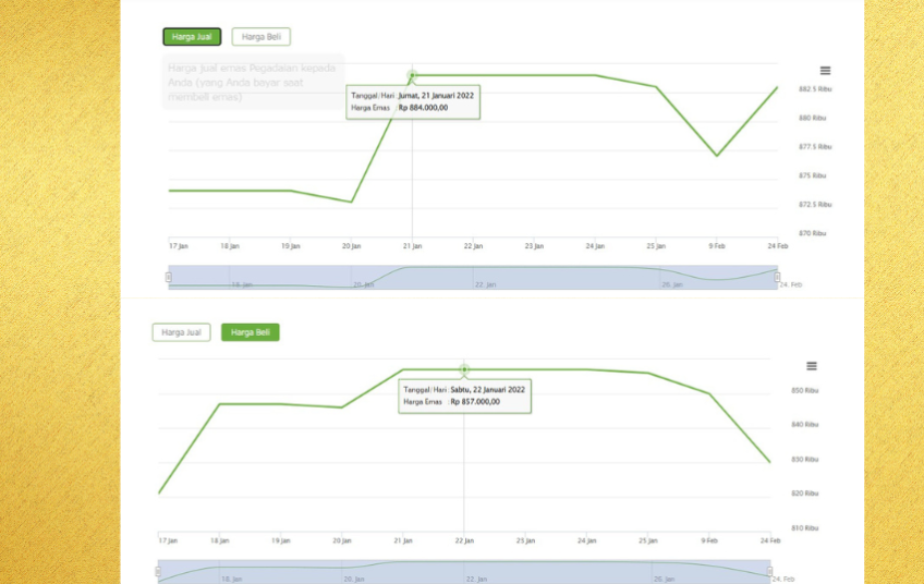 Harga emas 24 karat cetakan Antam ukuran 1 gram, dijual di Pegadaian seharga Rp1.030.000, naik Rp11.000. Sementara itu emas UBS dijual seharga Rp979.000, naik Rp15.000.